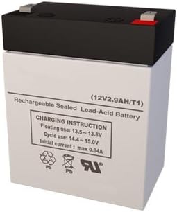 Зображення 1: SigmasTek CP1229 12 Volt 2.9 AmpH SLA Replacement Battery. The battery is white with a black top, featuring F1 terminals. The label indicates it is a "Rechargeable Sealed Lead-Acid Battery (12V2.9AH/T1)" and provides charging instructions: "Floating use: 13.5-13.8V, Cycle use: 14.4-15.0V, Initial current: max 0.84A."