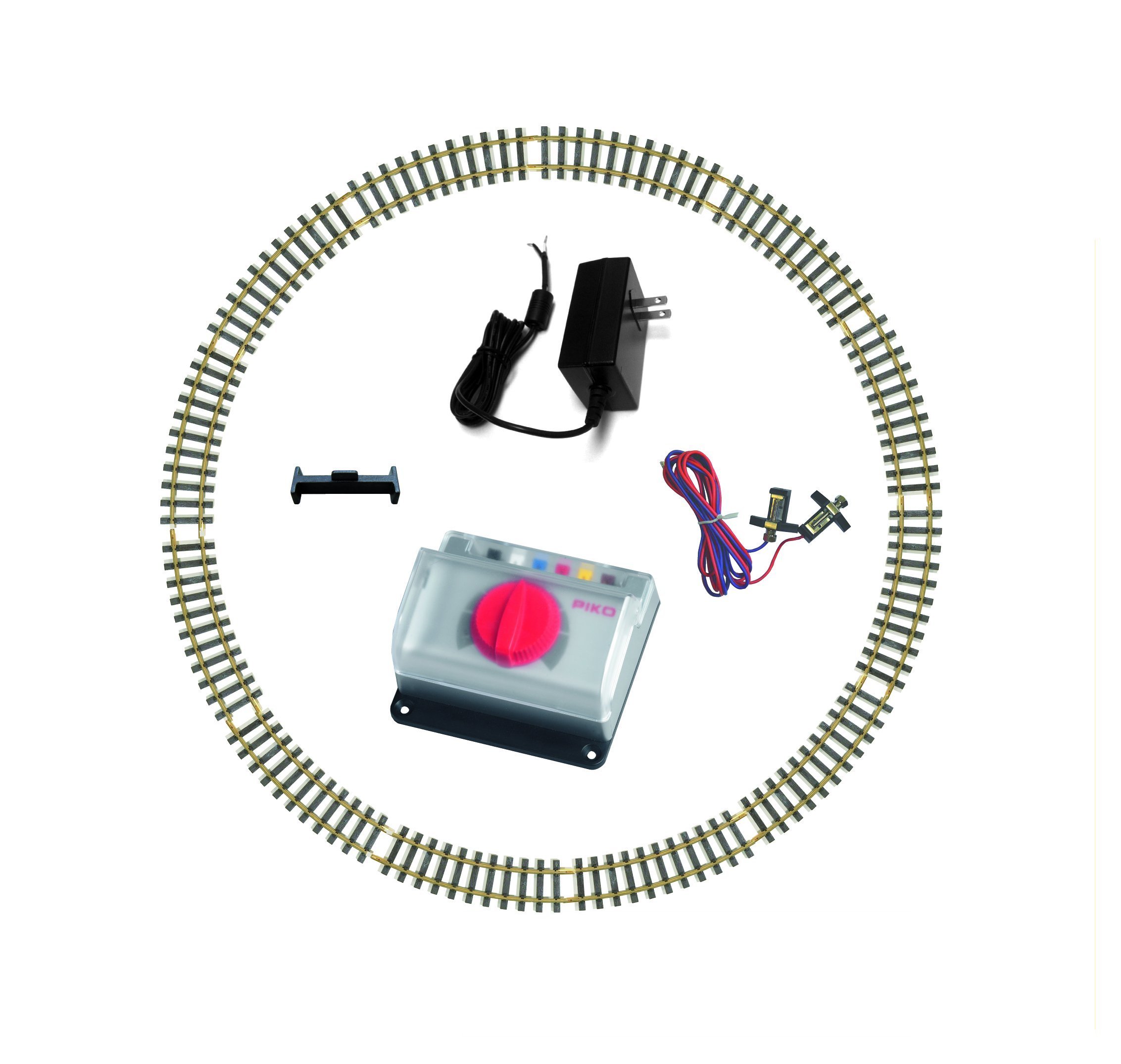 Зображення: Колишній/колишняample layout of the Piko G Scale Track and Power Set components, showing track pieces, a power supply, and a controller. This image illustrates the typical items included in the set and how they might be arranged during initial setup.