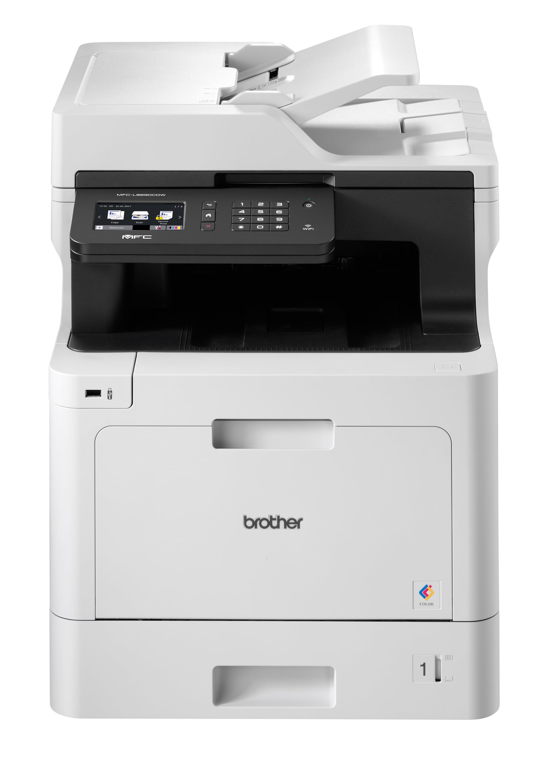 Фронт view of the Brother MFC-L8690CDW, showing the control panel and paper output tray.