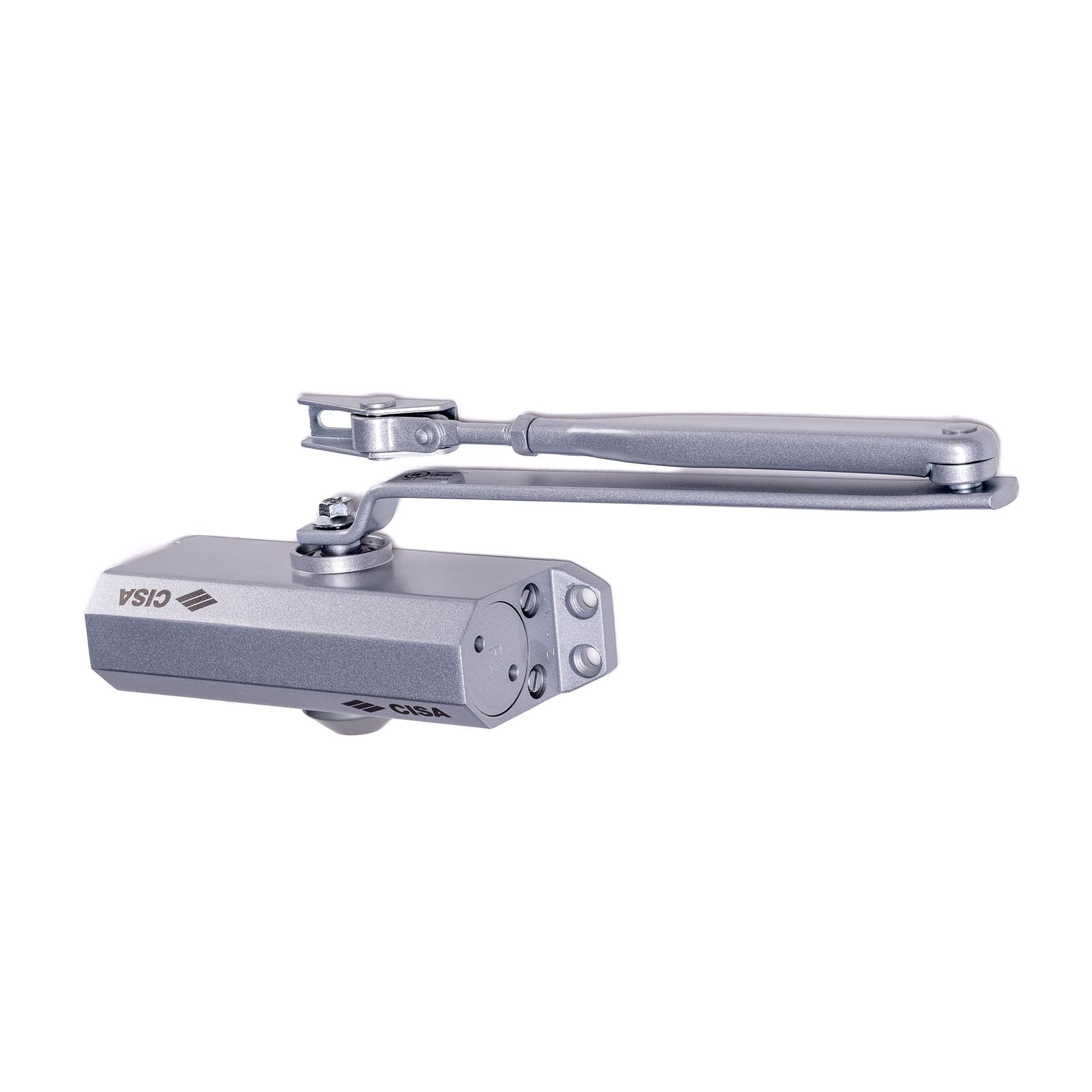 The CISA Serie 604 door closer consists of the main body, an arm assembly, and adjustment valves. It is supplied with all necessary fixing screws and a mounting template for straightforward installation.
