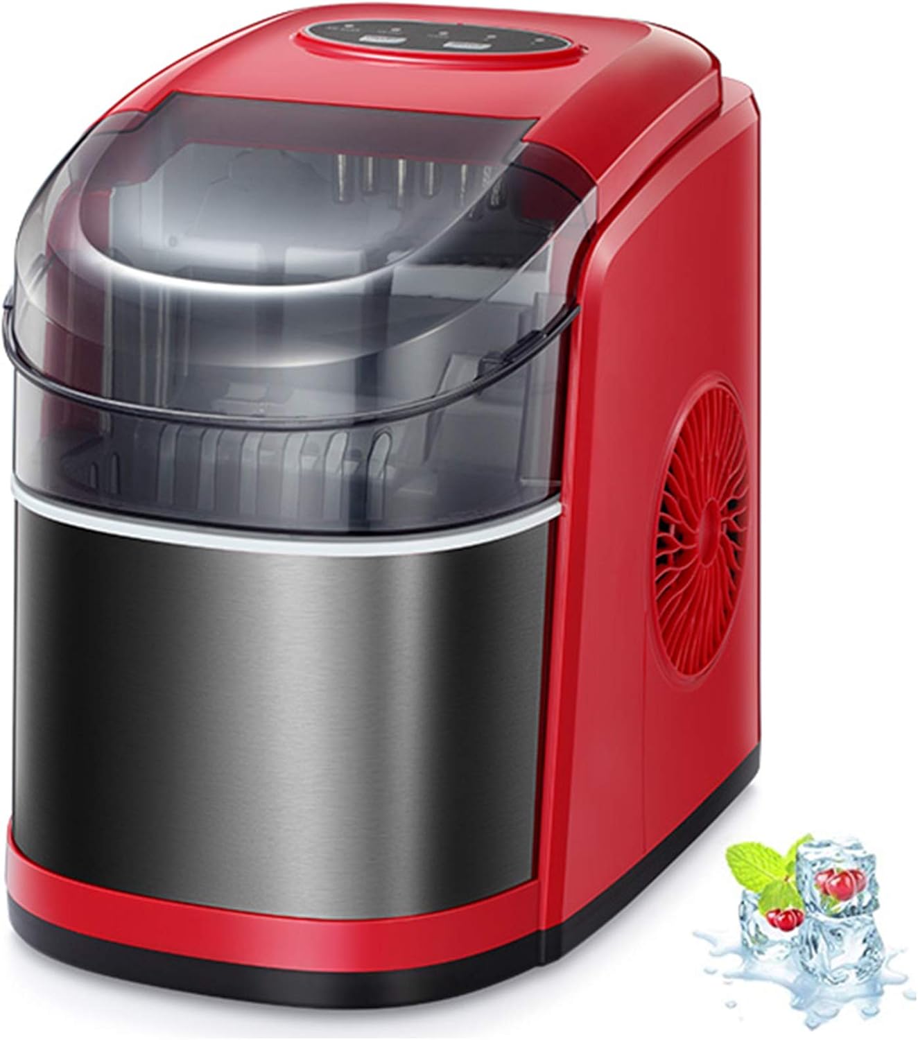 This image displays the overall design of the Kismile ice maker, featuring its compact red and black casing with a transparent lid, ideal for countertop placement.