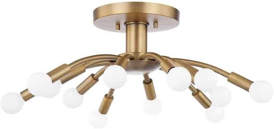 This image displays the complete Troy Lighting Tristan 12-Light Semi-Flush Mount fixture. It features a central brass canopy that attaches to the ceiling, with twelve radiating arms of varying lengths, each terminating in a bulb socket. The fixture has a modern, sputnik-like design, showcasing its brass finish and the arrangement of its light sources.
