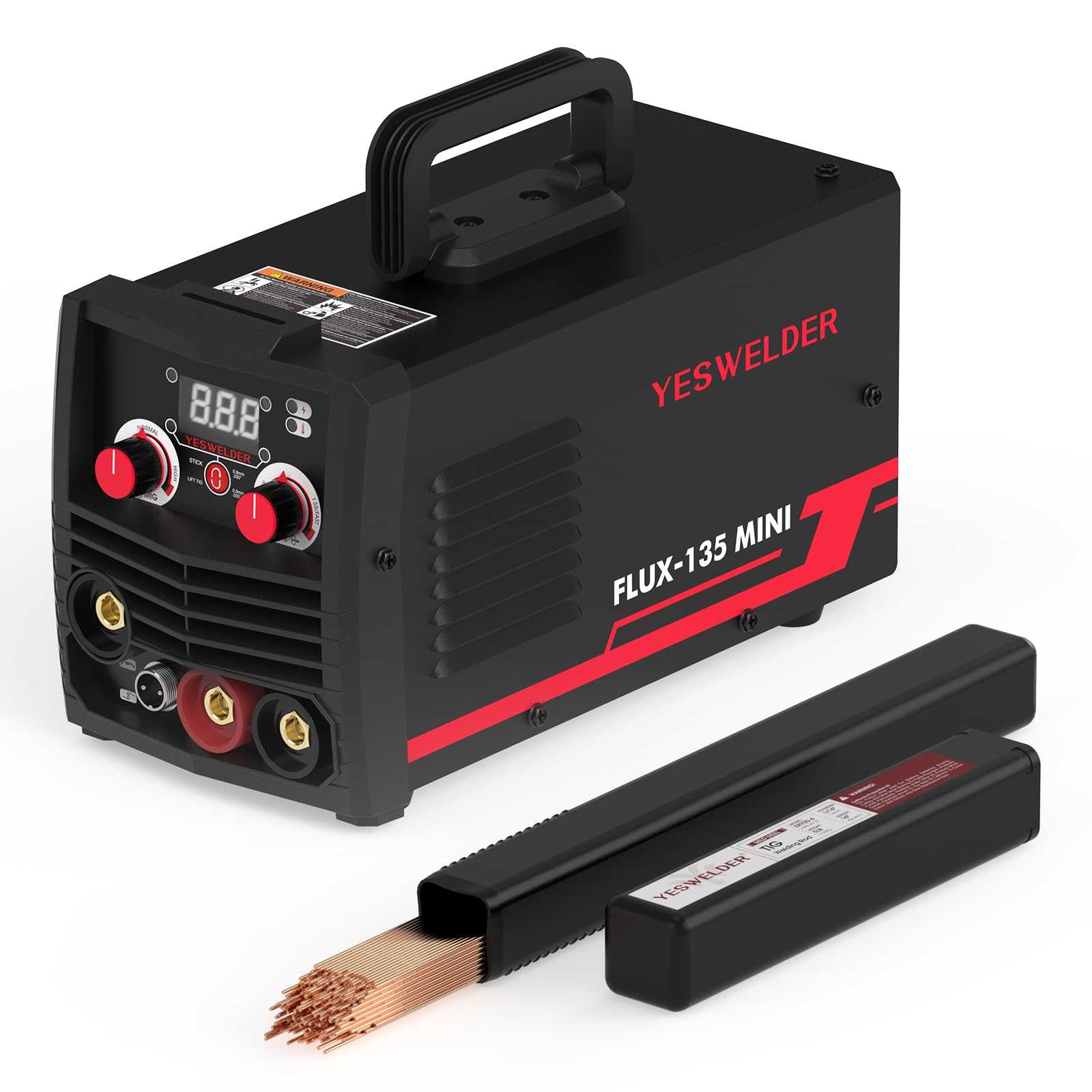 The YESWELDER FLUX-135 MINI is a versatile 135Amp 3-in-1 welding machine designed for various welding tasks. It supports Flux Core Gasless MIG, Stick, and Lift TIG welding processes. This machine is suitable for both beginners and experienced welders due to its intuitive controls and synergic features.