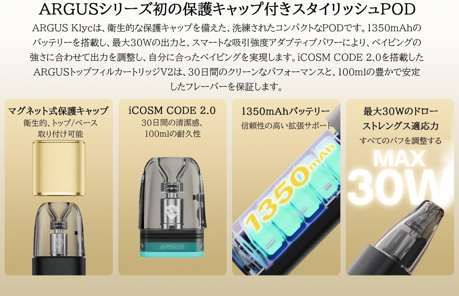 The VOOPOO Argus Klyc Kit is a compact and stylish pod system designed for both Mouth-to-Lung (MTL) and Restricted Direct-to-Lung (RDL) vaping. It features a built-in 1350mAh battery, offering up to 30W of adjustable power output. The device incorporates precise airflow adjustment and adaptive power for a customized vaping experience. Equipped with iCOSM CODE 2.0 flavor technology, it ensures a clean and consistent taste. A magnetic protective cap is included to maintain hygiene and prevent dust intrusion.