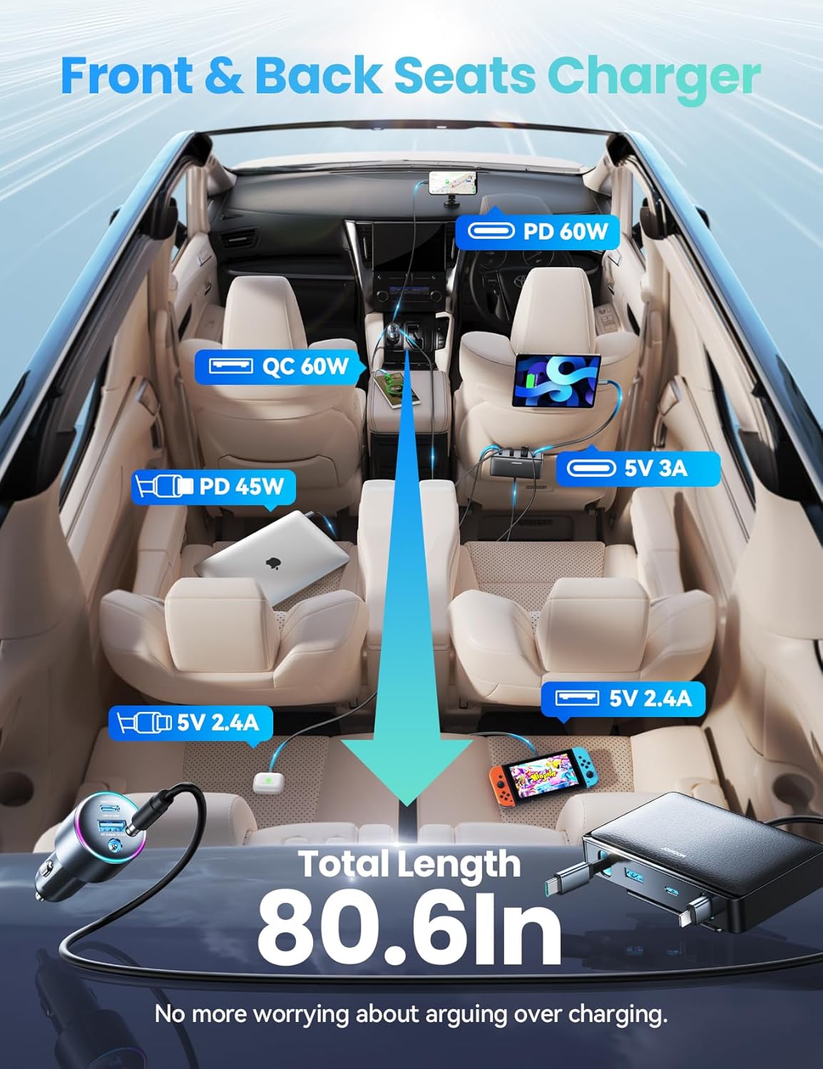 - Розширена довжина кабелю: Features an 86.6-inch (approximately 2.2 meters) extra-long main cable, allowing the charging hub to reach all corners of your vehicle, from front to back seats.